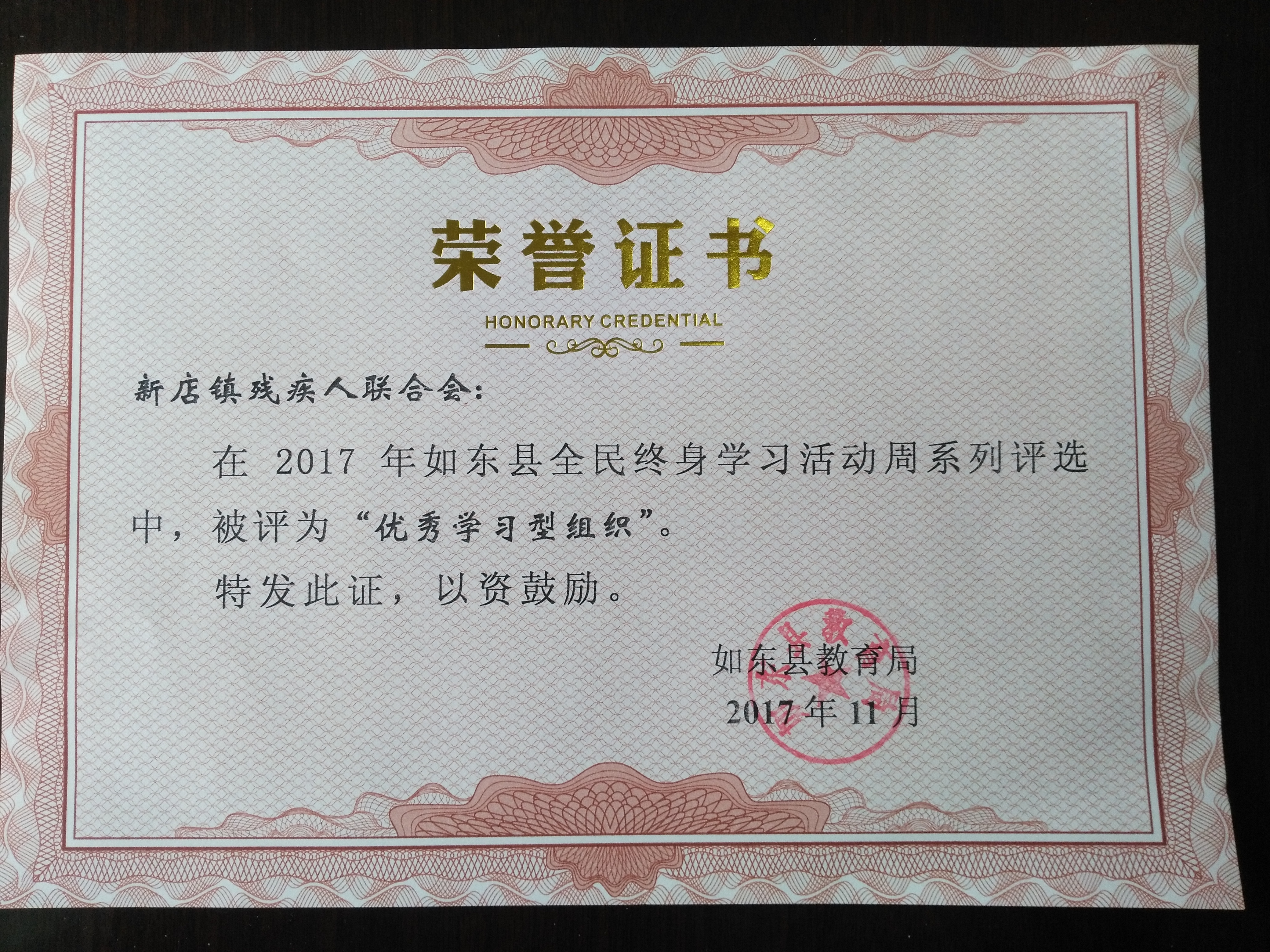 日前,新店镇残疾人联合会在2017年如东县全民终身学习活动周系列评选中,被如东县教育局评为“优秀学习型组织”。这是对新店镇残联在学习宣传方面的肯定,同时也是对新店镇残联全体人员的鼓励。